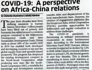日前,尼日利亞非洲經(jīng)濟(jì)研究*主任奧耶坤納在尼主流媒體《每日信報(bào)》發(fā)表題為《新冠肺炎疫情:透視非中關(guān)系》的評(píng)論文章,認(rèn)為非中關(guān)系平等互利,講求協(xié)調(diào)性而非競爭性,是南南合作的典范。面對(duì)新冠肺炎疫情,非中雙方需加強(qiáng)團(tuán)結(jié)合作抗疫,努力恢復(fù)經(jīng)濟(jì),繼續(xù)維持雙贏態(tài)勢。